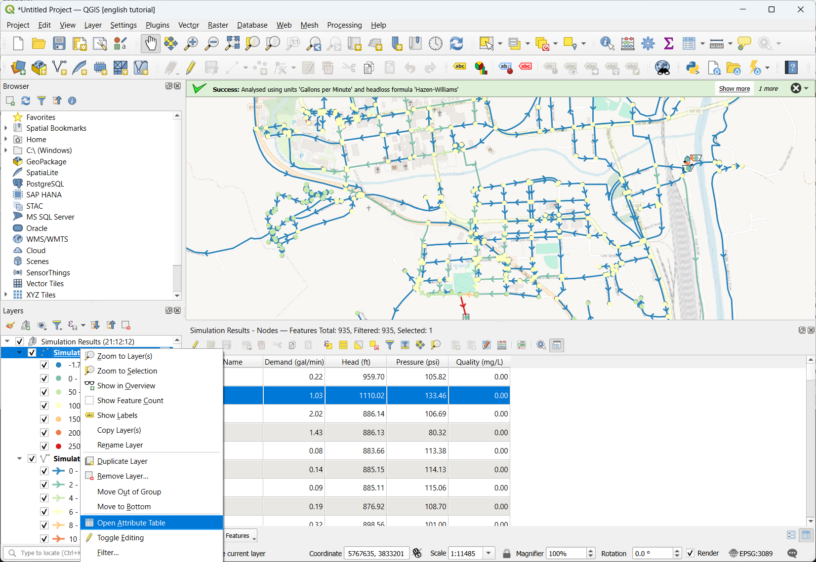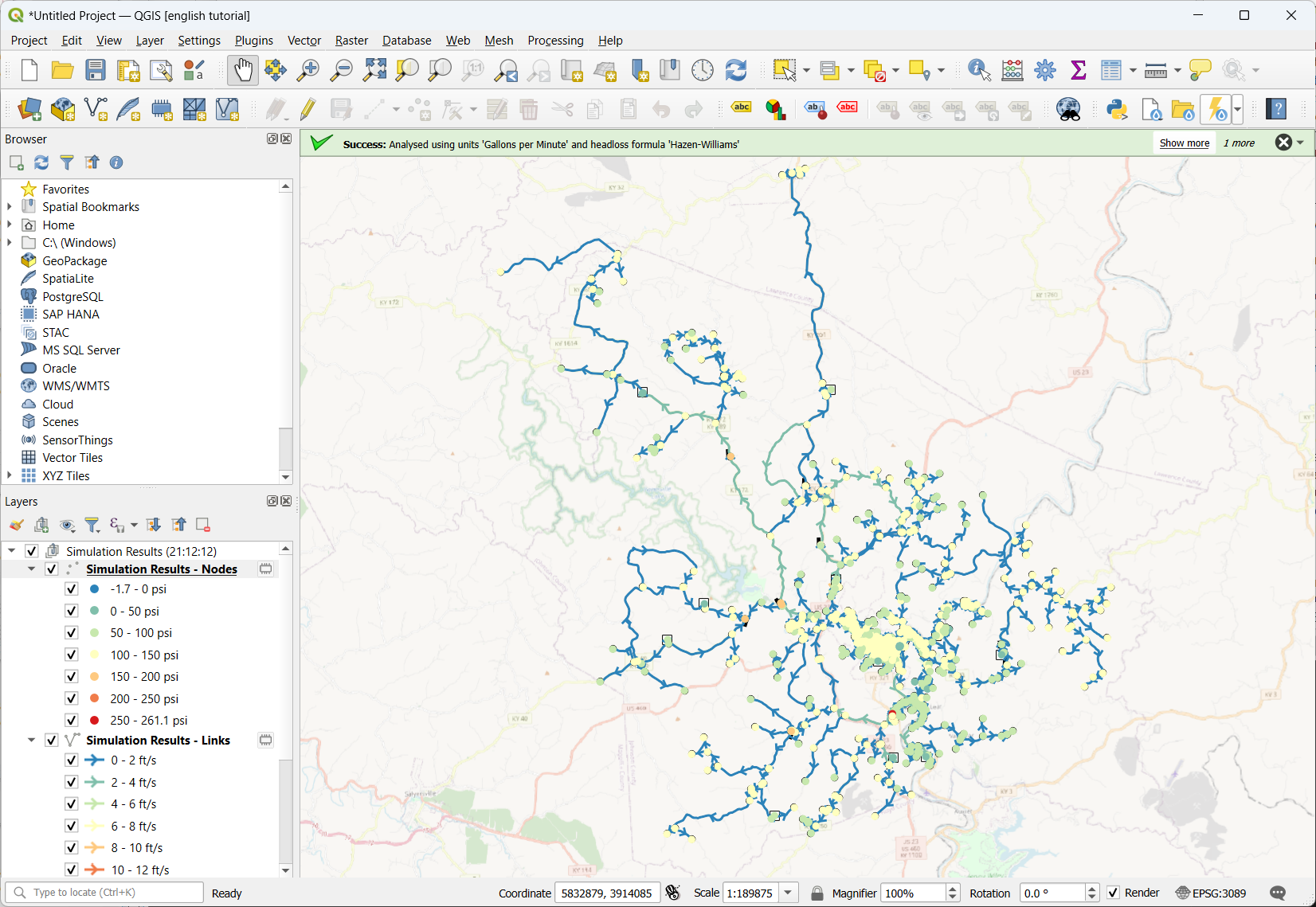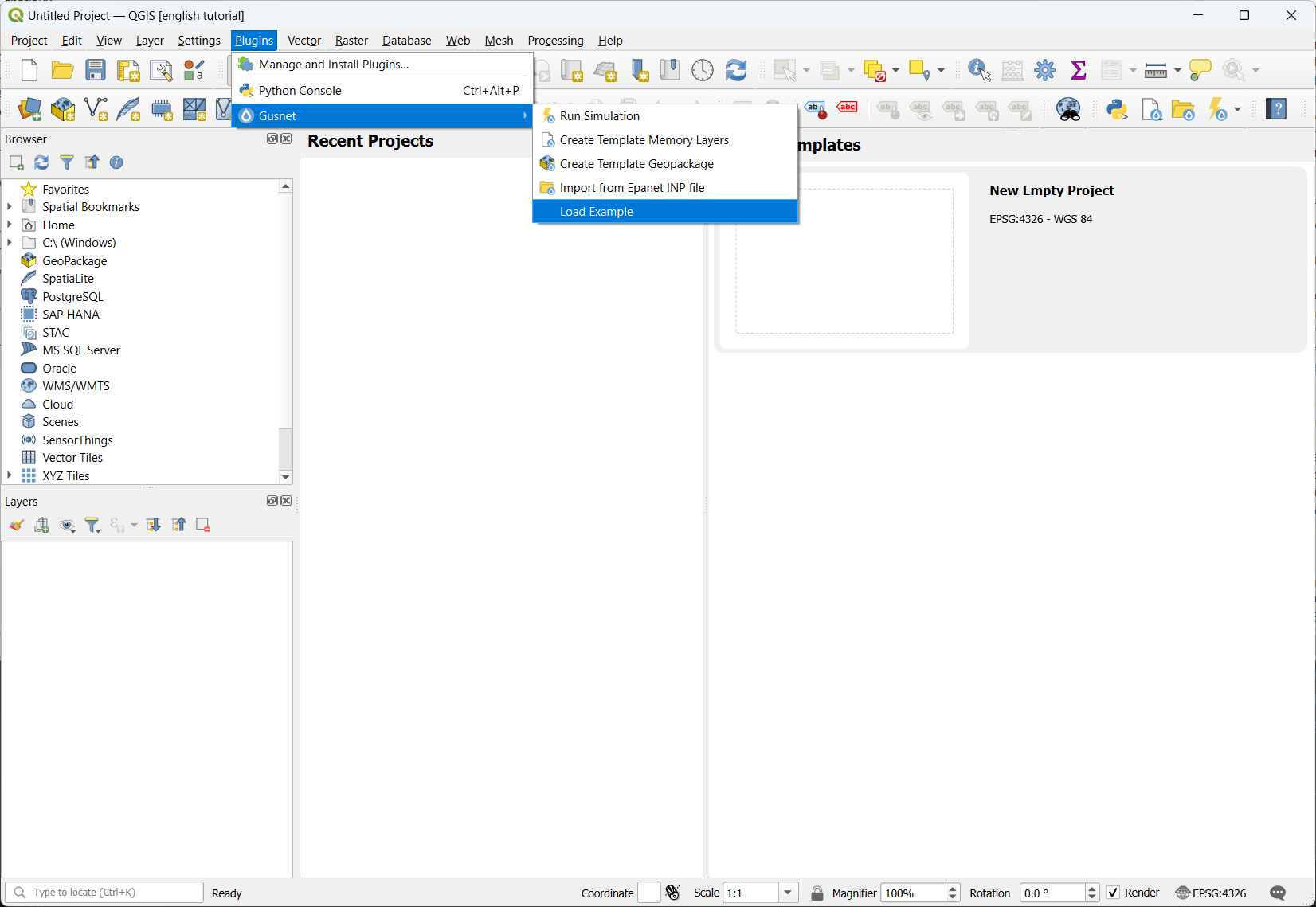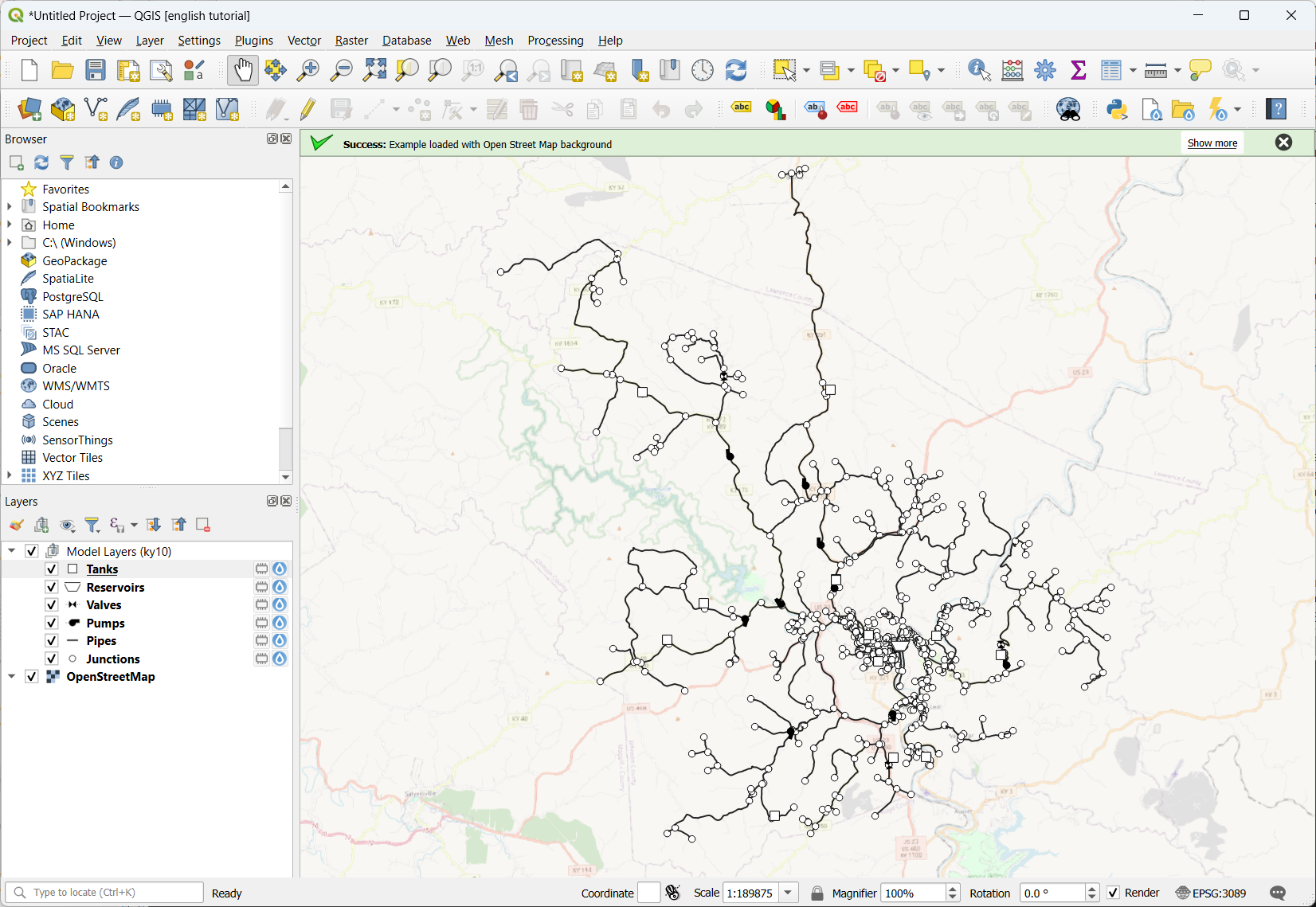 Example inp file will be loaded, along with an openstreetmap background. You will see the different layers loaded into the layers panel.